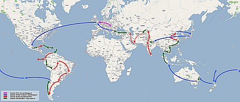 A Travelmood ajánlata csupán a kék és piros színnel jelölt repülőutakra vonatkozott, a köztük lévő zöld szakaszokat vízen és szárazföldön terveztem megtenni. Az útvonalterv közép-ázsiai szekciójára konkrét elképzelés ekkor még nem született. Azt tudtam, hogy szeretném Kirgizisztánt és Tádzsikisztánt is szemügyre venni, de hogy onnan hogyan fogok eljutni Törökországba, az közel sem volt tiszta (a szaggatott piros nyilak egy opcionális Dubaj-kitérőt jelképeznek).